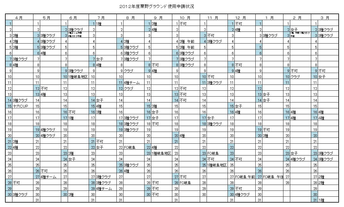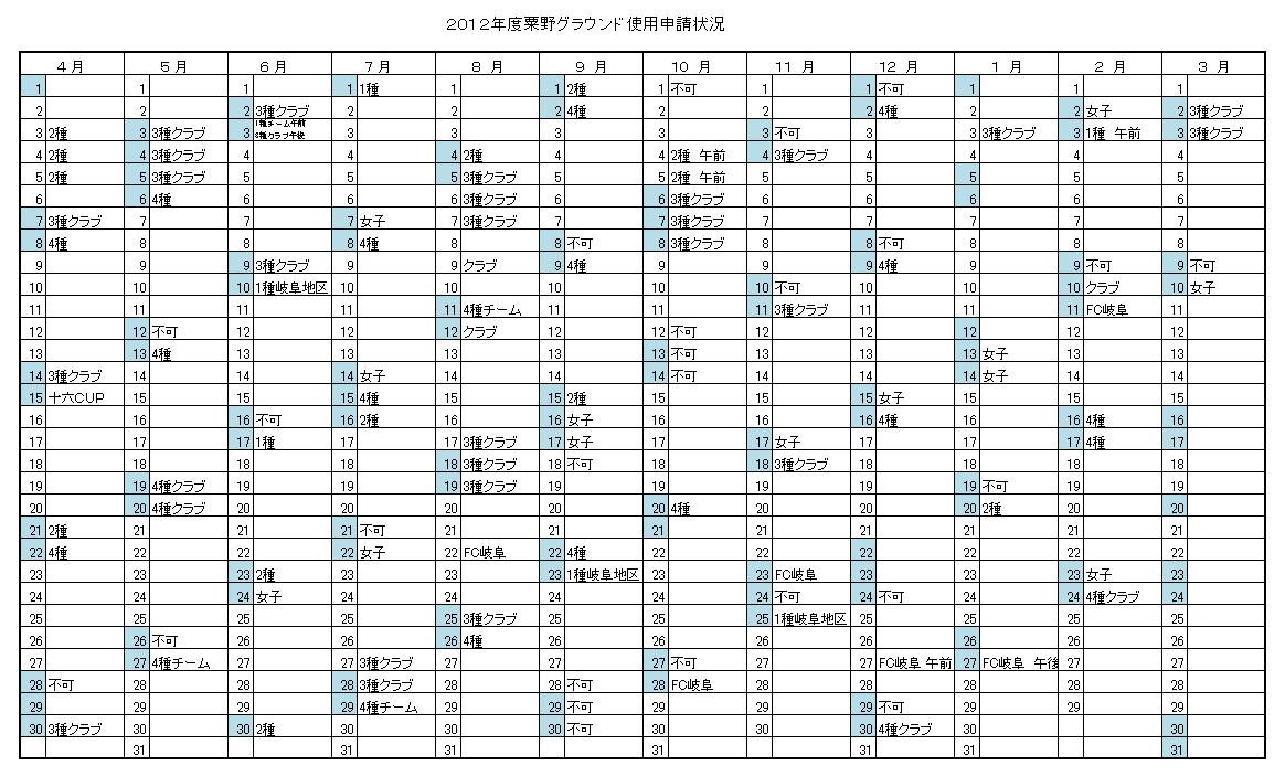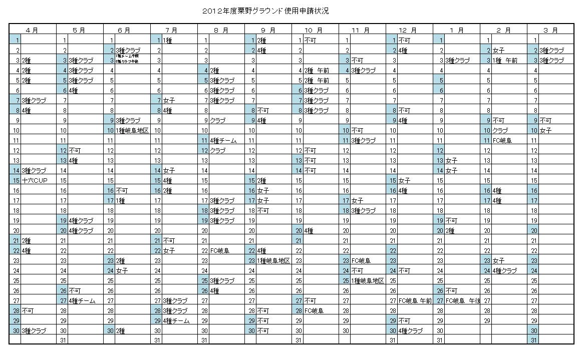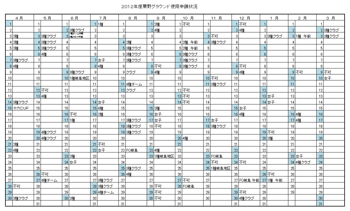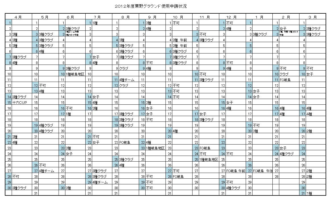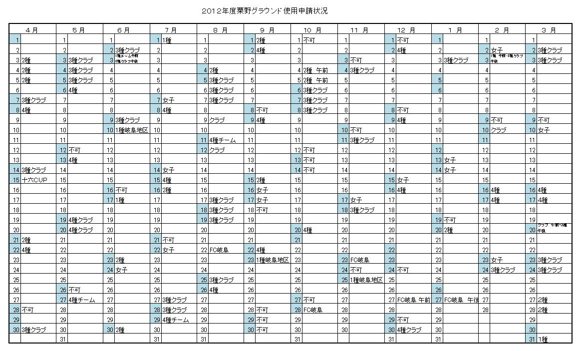 2012年度粟野グラウンド申請状況