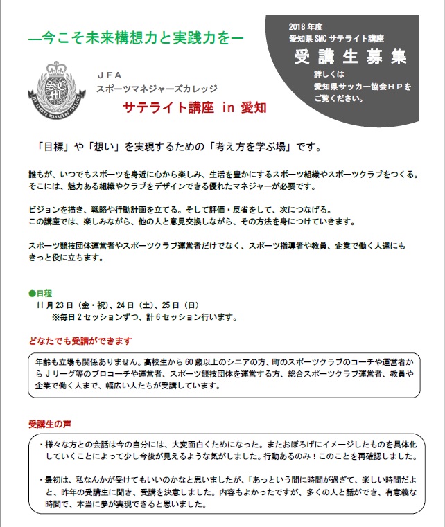 JFA Sports Managers College サテライト講座参加者募集(愛知)