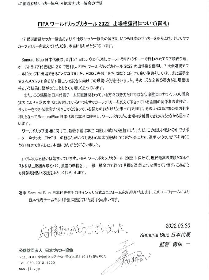 【日本代表】森保監督から礼状とサイン入り代表ユニフォームが届きました