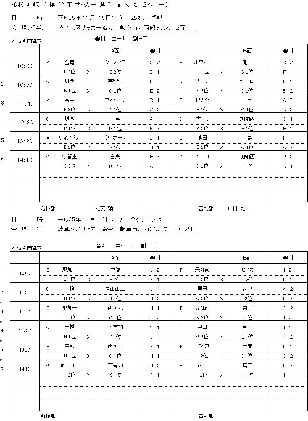 第46回県少年サッカー選手権大会 組合せ(2次リーグ時間表)