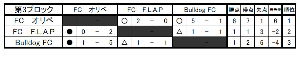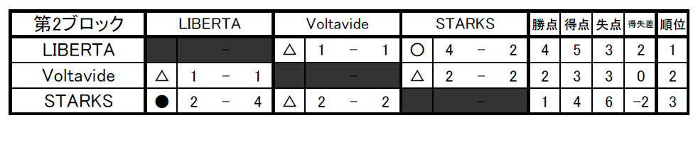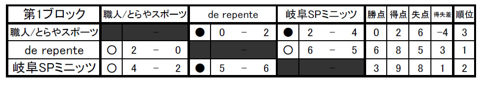 決勝トーナメント進出チーム第1ブロック1位 de repente第2ブロック1位 LIBERTA第3ブロック1位 FC オリベブロック2位-1 岐阜SPミニッツブロック2位-2 Voltavide