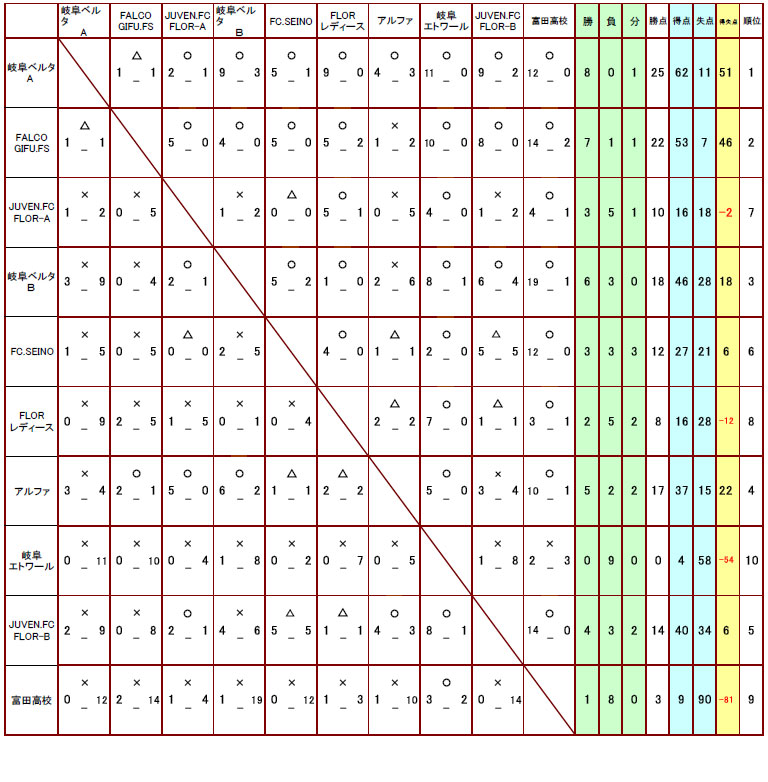 2008年度岐阜県女子フットサルリーグ成績表