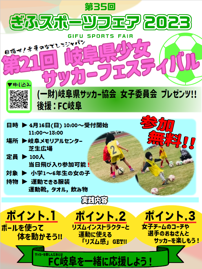 1 目的:岐阜県の女子サッカーの普及と活性化を目的とし、女性を対象としたサッカー体験会を開催する