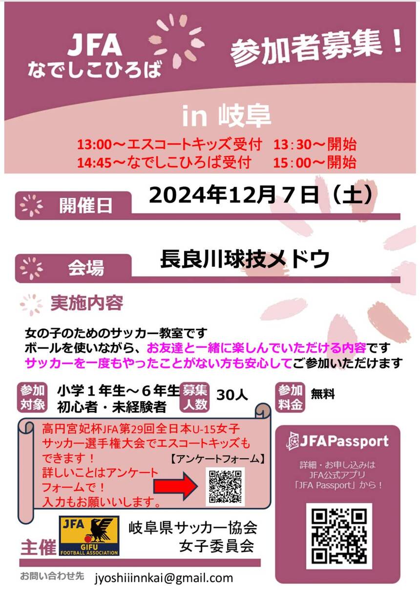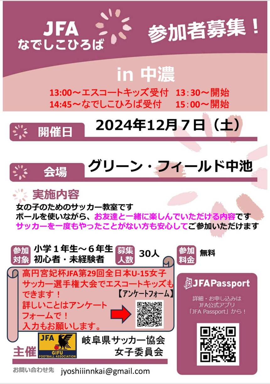 【女子】なでしこ広場 in 岐阜&中濃 開催! U-15全国エスコートキッズ一緒に募集