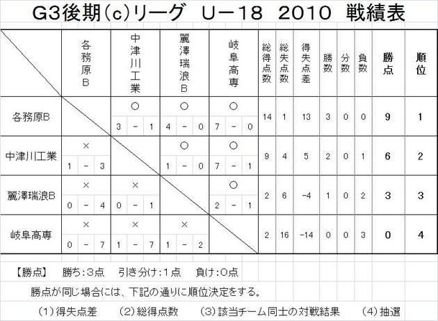 G3リーグ後期cグループ最終戦績表