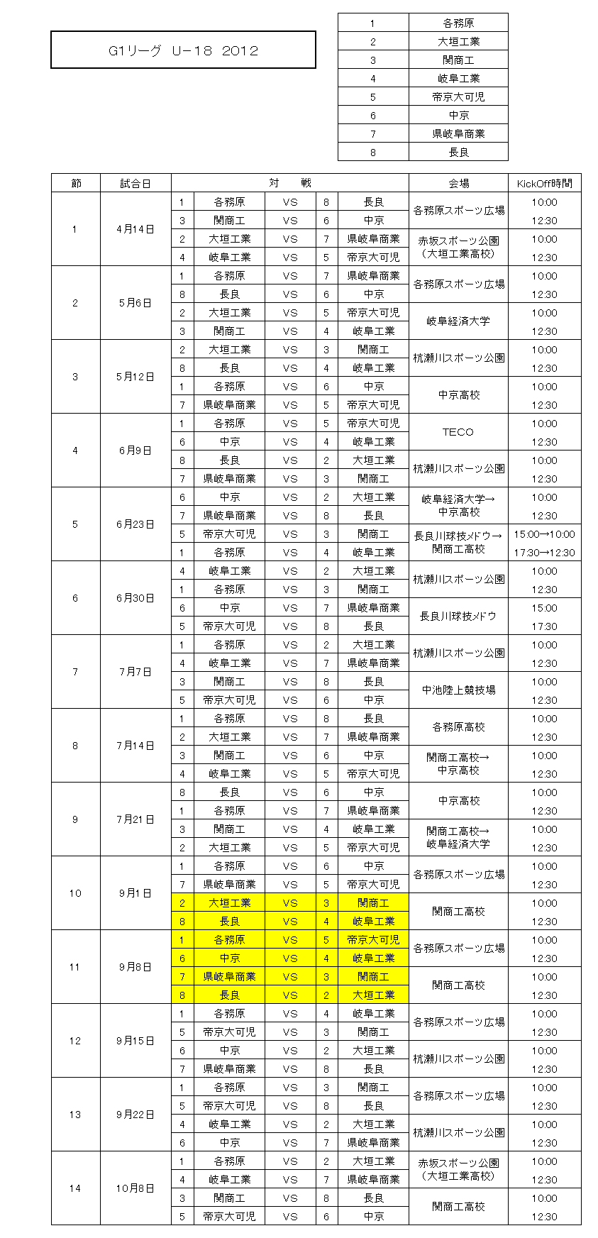 G1リーグ Uー18 2012 試合順の変更について