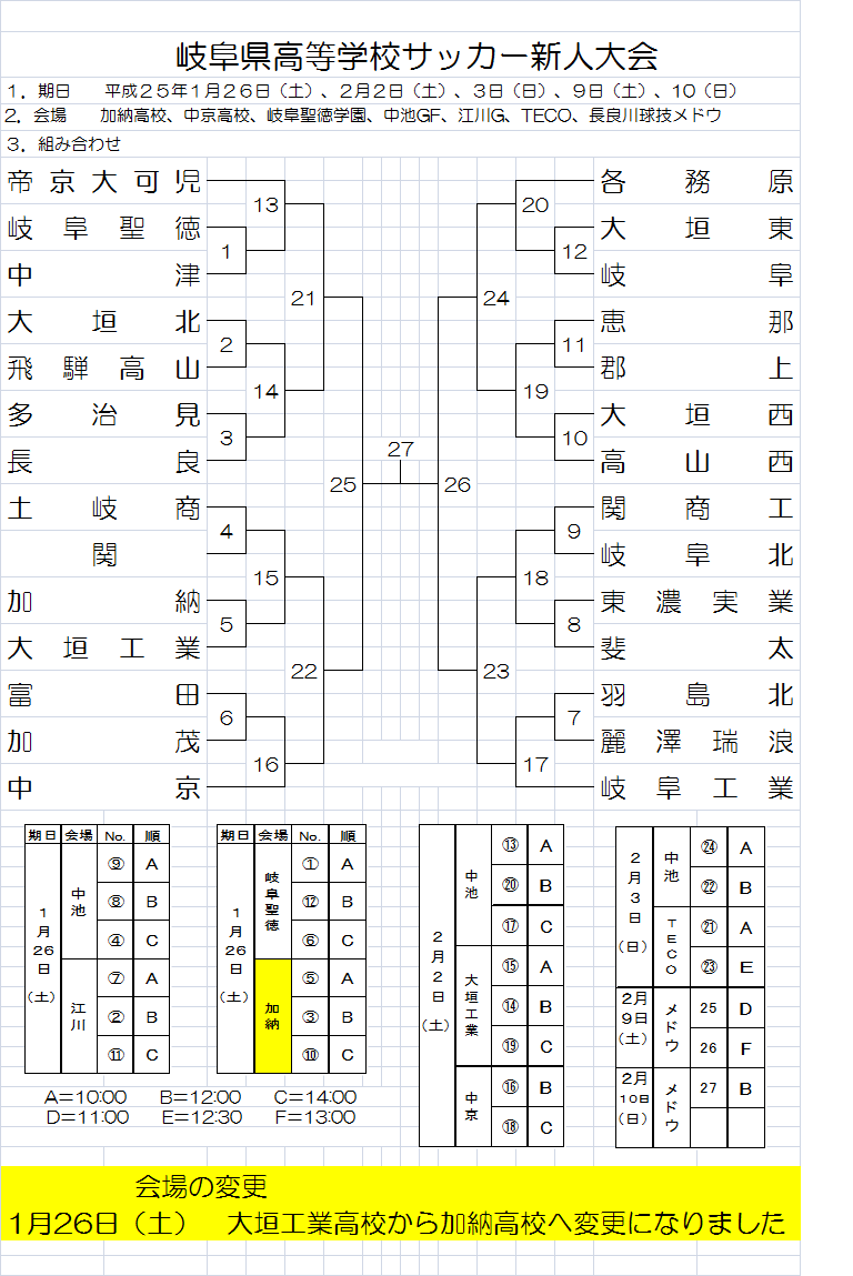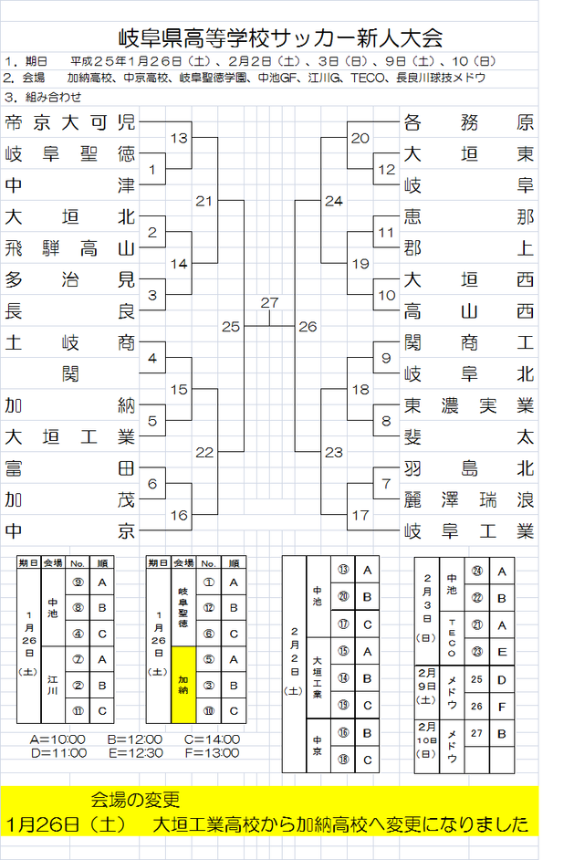 H24年度 岐阜県高校サッカー新人大会 1回戦(1/26)会場変更について
