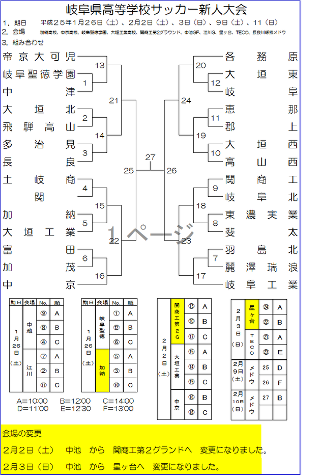 H24年度 岐阜県高校サッカー新人大会 2,3回戦会場変更について