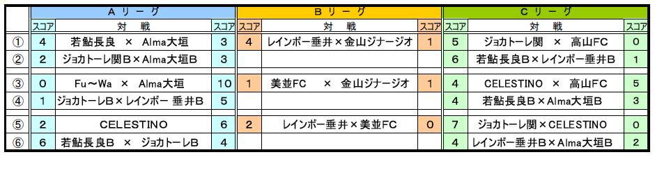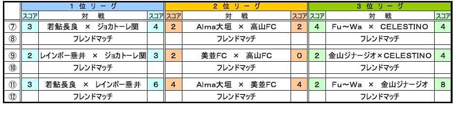 1位 ジョカトーレ関2位 レインボー垂井3位 若鮎長良4位 美並FC 5位 Alma大垣6位 高山FC7位 CELESTINO8位 金山ジナージオ9位 Fu~Wa