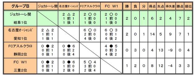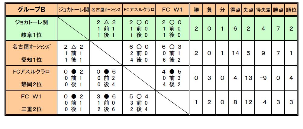 Bグループ1位:名古屋オーシャンズ 2位:ジョカトーレ関 3位:FC W1 4位:FCアスルクラロ