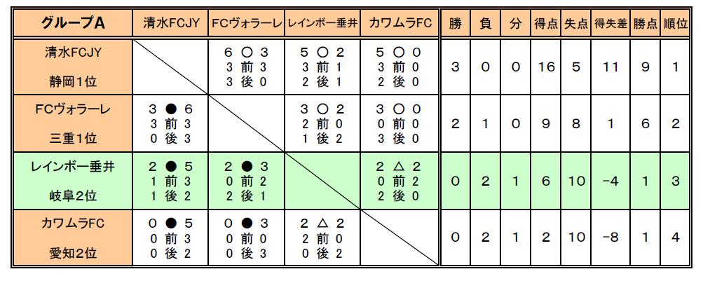 Aグループ1位:清水FCJY2位:FCヴォラーレ3位:レインボー垂井4位:カワムラFC