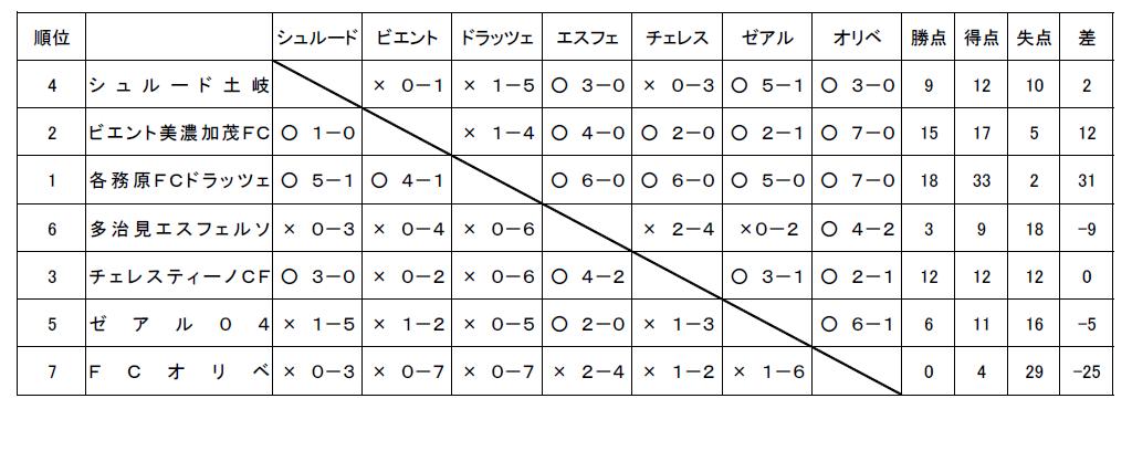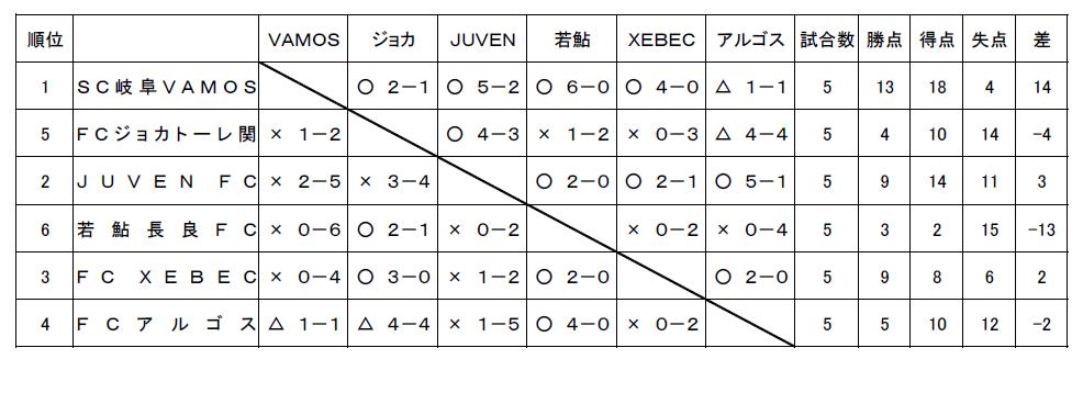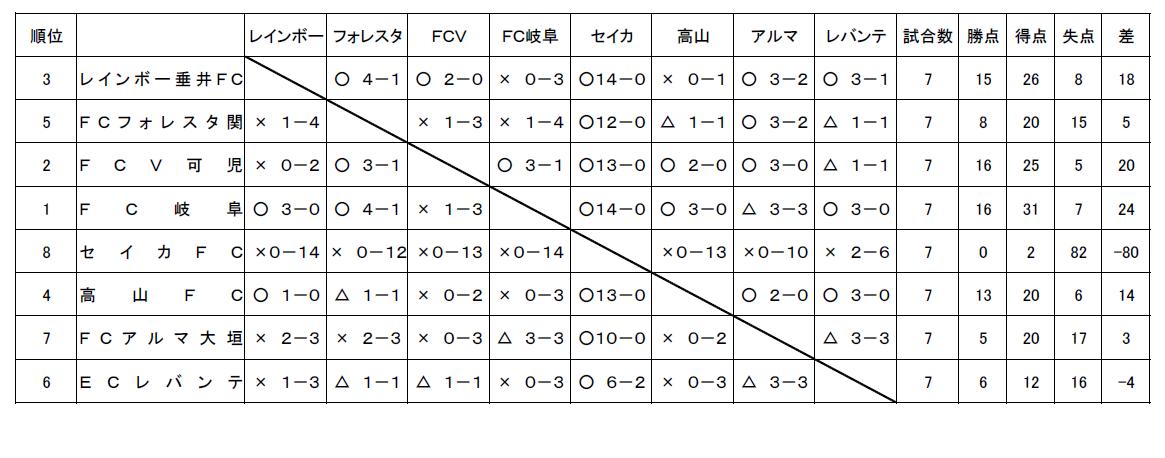 6位の若鮎長良FCは2部自動降格、5位FCジョカトーレ関は入替戦出場。