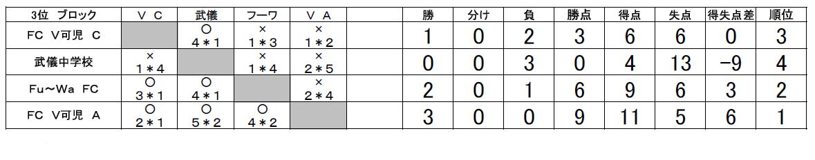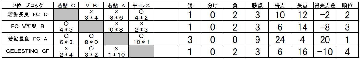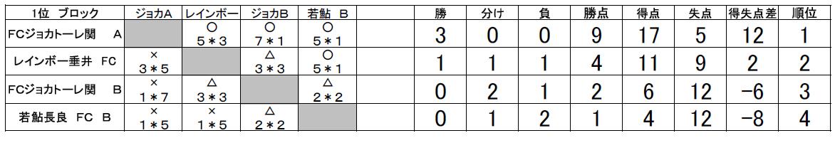 1位 FCジョカトーレ関 A 2位 レインボー垂井 FC 3位 FCジョカトーレ関 B 4位 若鮎長良 FC B 5位 若鮎長良 FC A 6位 若鮎長良 FC C 7位 FC V可児 B 8位 CELESTINO CF 9位 FC V可児 A10位 Fu~Wa FC11位 FC V可児 C12位 武儀中学校