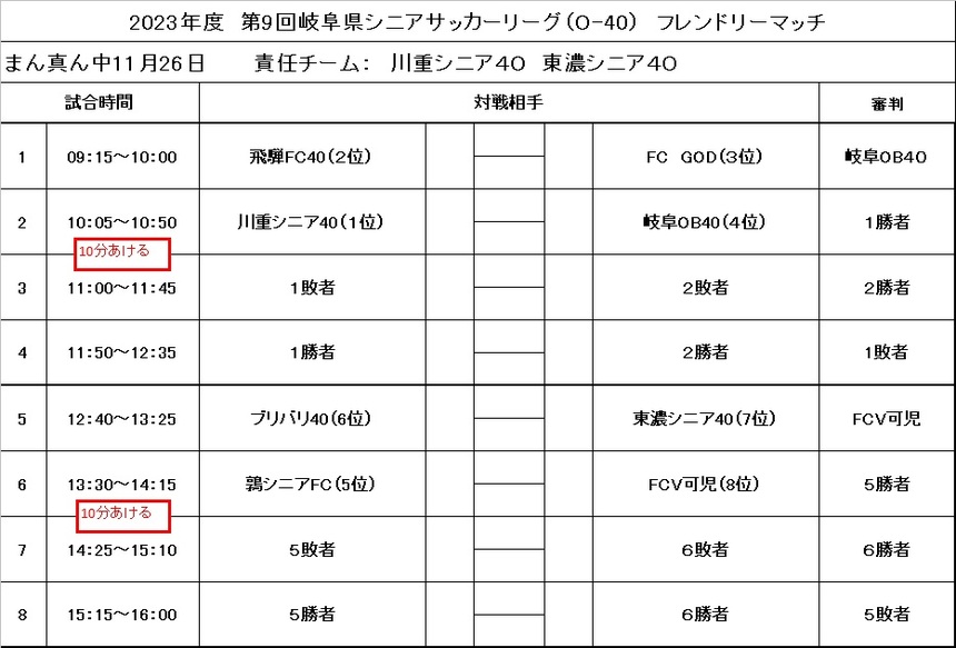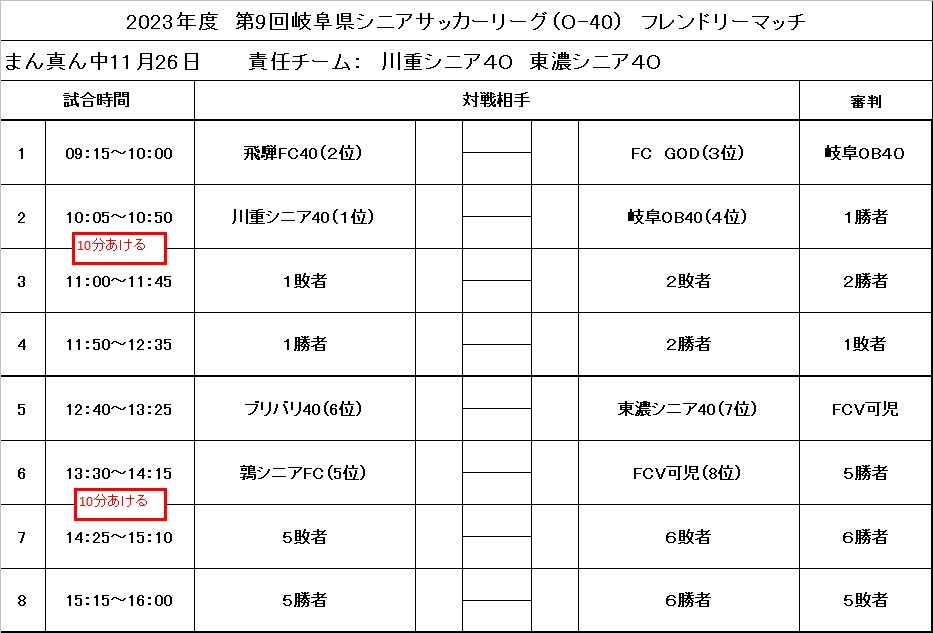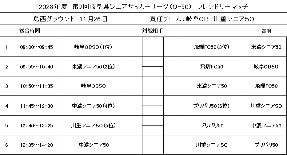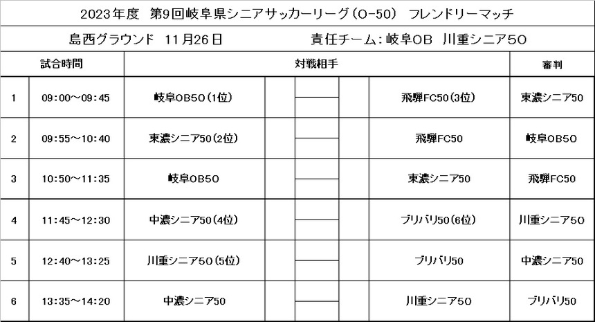 県シニアリーグ11月26日フレンドリーマッチ組合せO-40・O-50