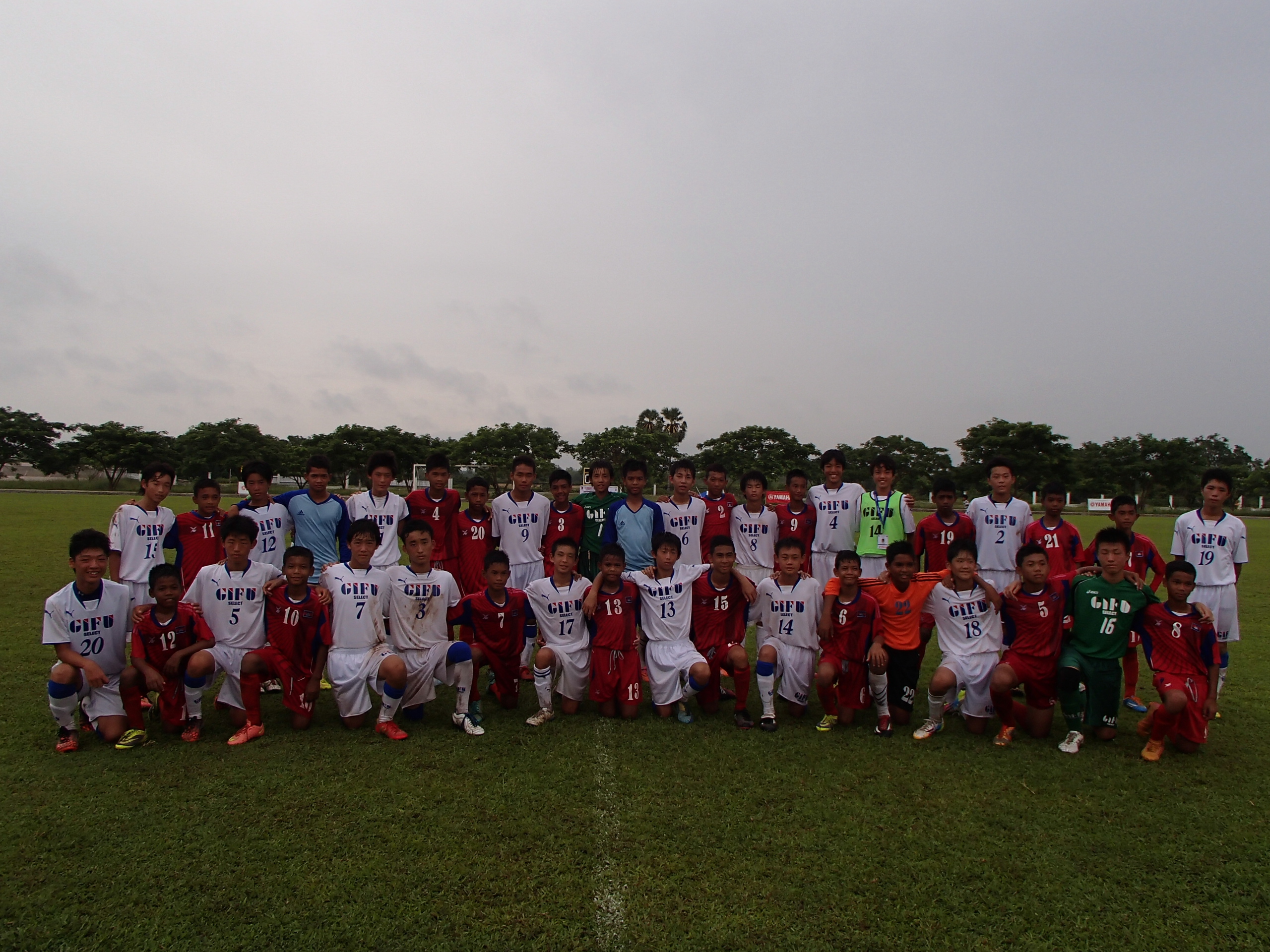 試合は岐阜が立ち上がりから攻勢をかけ、3分に先取点を奪いました。その後、ポゼッションを奪い岐阜が優位に試合を進め、12分に追加点。しかし、13分、相手の堅い守備からボールを奪われ、速攻で1点を返されます。その後、体は小さくてもあたり負けしないU-14 Combodia National Teamに押し込まれる時間もありましたが、選手たちは落ち着いて対応し、26分右クロスからゴールに流し込み3-0で前半を終了しました。