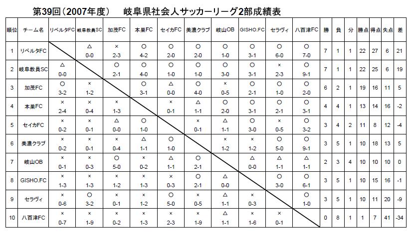 第39回(2007年度) 岐阜県社会人サッカ-リ-グ2部成績表